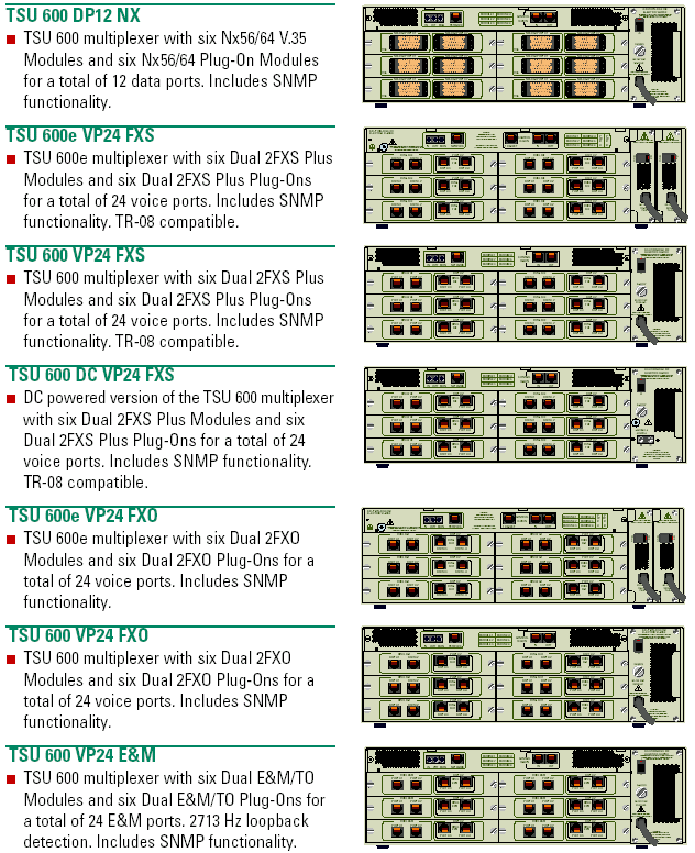Single-port and dual-port data modules support access to Frame Relay, DDS or Basic Rate ISDN over T1 facilities. Voice modules allow access to analog voice circuits or a PBX. The TSU 600/600e supports mixed-mode networks incorporating voice, data and video.