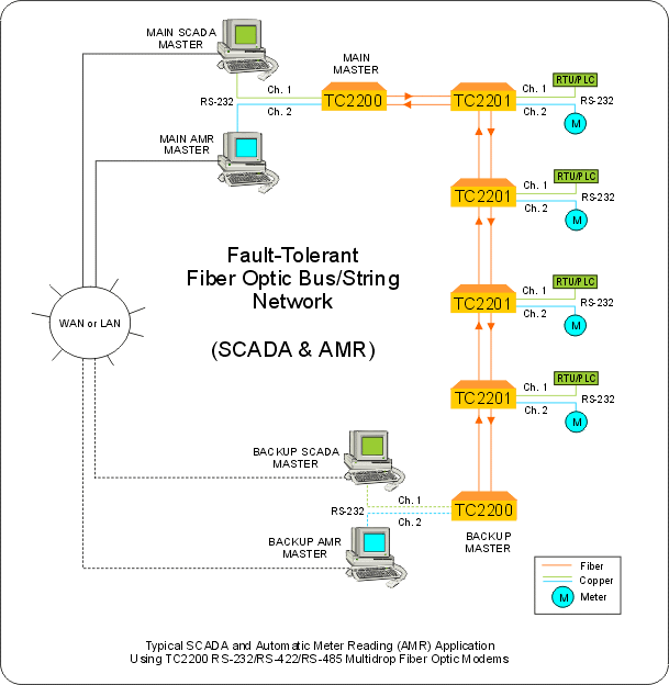 Available for either Bus or String topologies, the TC2200 Multi-Drop Fiber Optic Modem links monitoring devices (RTUs or PLCs) fitted with RS-232, RS-422 or RS-485 interfaces to a Host controller or CPU. The electrical interface can be either RS-232, RS-422 or RS-485. The RS-485 electrical port can be multi-dropped. Asynchronous data rates can be up to 38.4 Kbps. A special version (TC2200T) is available for hardened temperature applications (-40°C to 70°C). Each unit comes with one or two pairs of fiber interfaces and either two channel RS-232 or one channel RS-422/RS-485. The second RS-232 channel can be used for data, RTS/CTS handshaking signals or as a telephone extension with the Model TC1900 "Quick-Talk" Telephone Extenders. For applications requiring maximum reliability, the TC2200 is also available in a dual Master "Fault Tolerant" version, providing a Back-up Master unit. In the event of cable breakage or a defective Remote unit, the backup Master will start polling the Remote units from the opposite direction. The primary and secondary Master units can be located anywhere on the fiber bus network. Remote units can be daisy-chained. The "Anti-Streaming" capability is standard. Anti-streaming prevents a single node failure (e.g. "babbling") from bringing down the entire network. 16 Diagnostic LEDs are provided for "Tx," "Rx," "Fault" and "Power". The TC2200 is compatible with all popular types and sizes of fiber optic cable and is available multimode (850/1300nm) or single mode (1300/1550nm). Fiber optic connectors are ST or FC. Electrical connectors are DB25 female. Power is 12VDC; optional 24VDC, -48VDC, or 115/230VAC with an external power cube. For ordering purposes, the TC2200 is the Master Unit; TC2201 is the Slave unit. Technical Specs